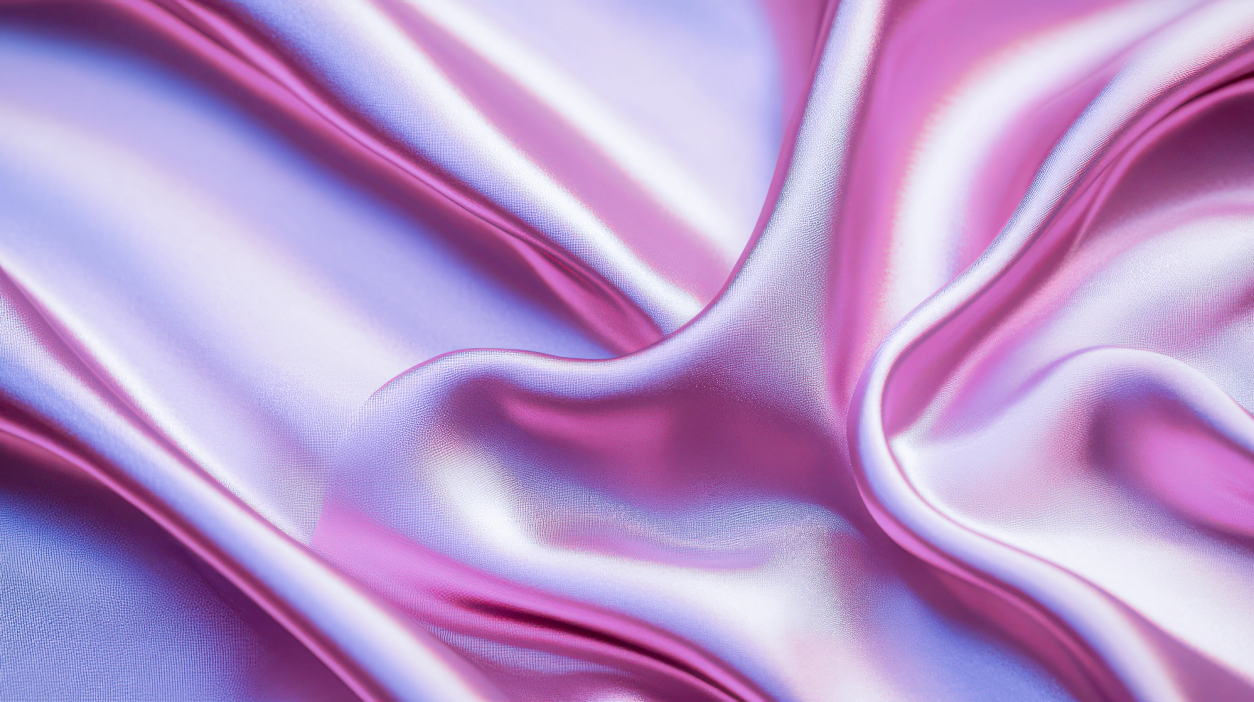 AIで生成したピンクと紫のサテン生地を表現した画像素材です。淡いピンクから濃い紫へグラデーションしながら、流動的に波打つドレープが複数方向に折れ重なり、光沢感のあるテクスチャーが白く反射しています。ファッションデザイン、テキスタイル表現、背景素材として活用できます。