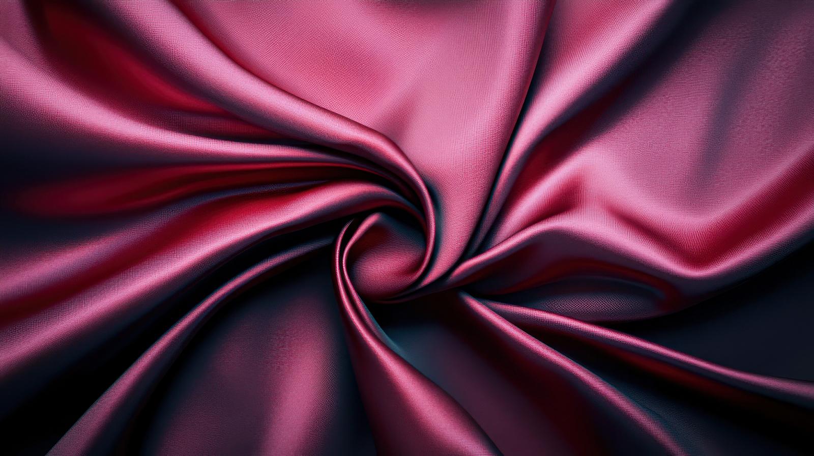 AIで生成したワインレッドのサテン生地が渦を巻く画像素材です。中心に向かってねじれるように集まる布の表面に、なめらかなしわと深みのある陰影が広がっている。ファッション・ブライダル・高級感のあるデザイン背景としてお使いいただけます。