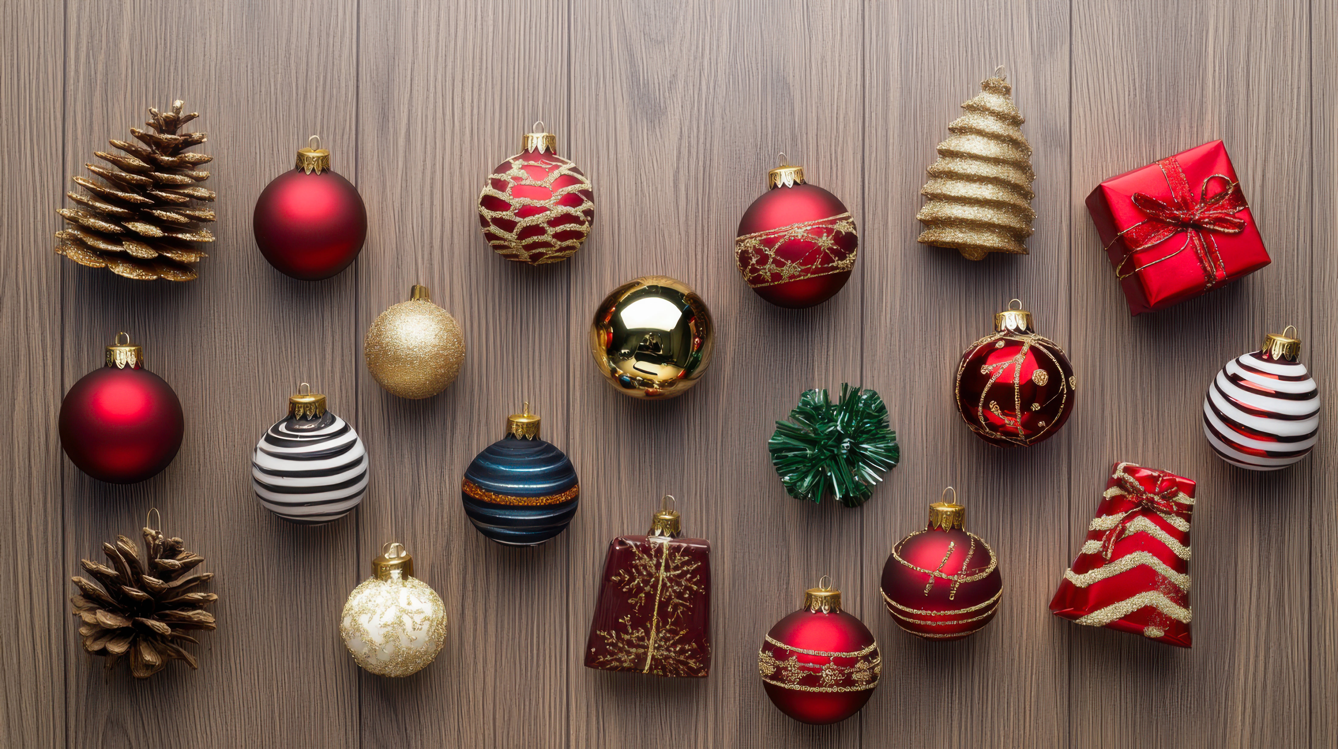 木製テーブルの上に配置された赤・ゴールド・白のクリスマスオーナメント