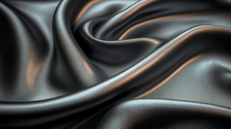 黒いサテン生地が波状に折り重なり、光沢が輝く画像