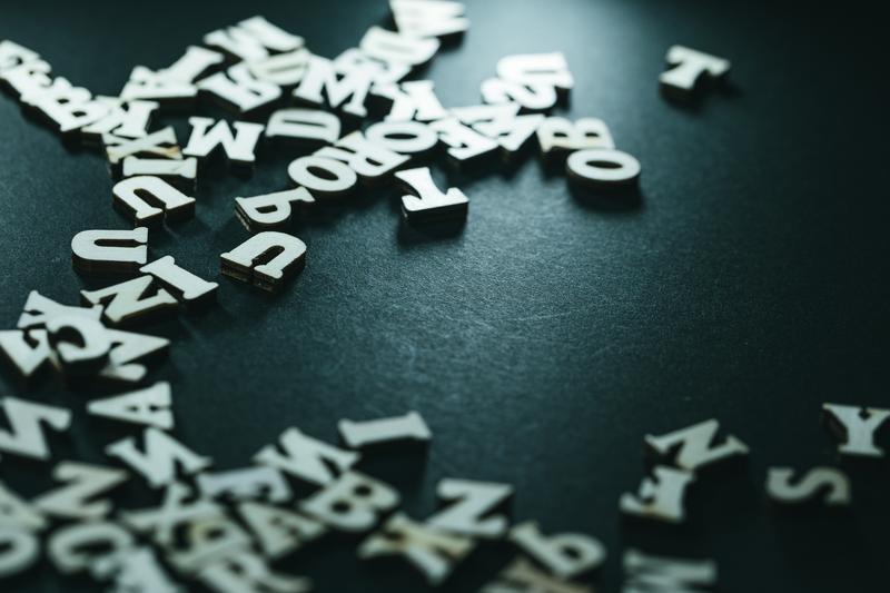 白い木製のアルファベットが緑灰色の板の上に散らばった写真素材です。立体的なアルファベット文字が複数散乱し、ピント位置によって手前と奥で焦点が異なり、光が文字表面に反射しています。ハンドメイドやDIYクラフト、アルファベット素材が必要なデザイン制作などにおすすめです。