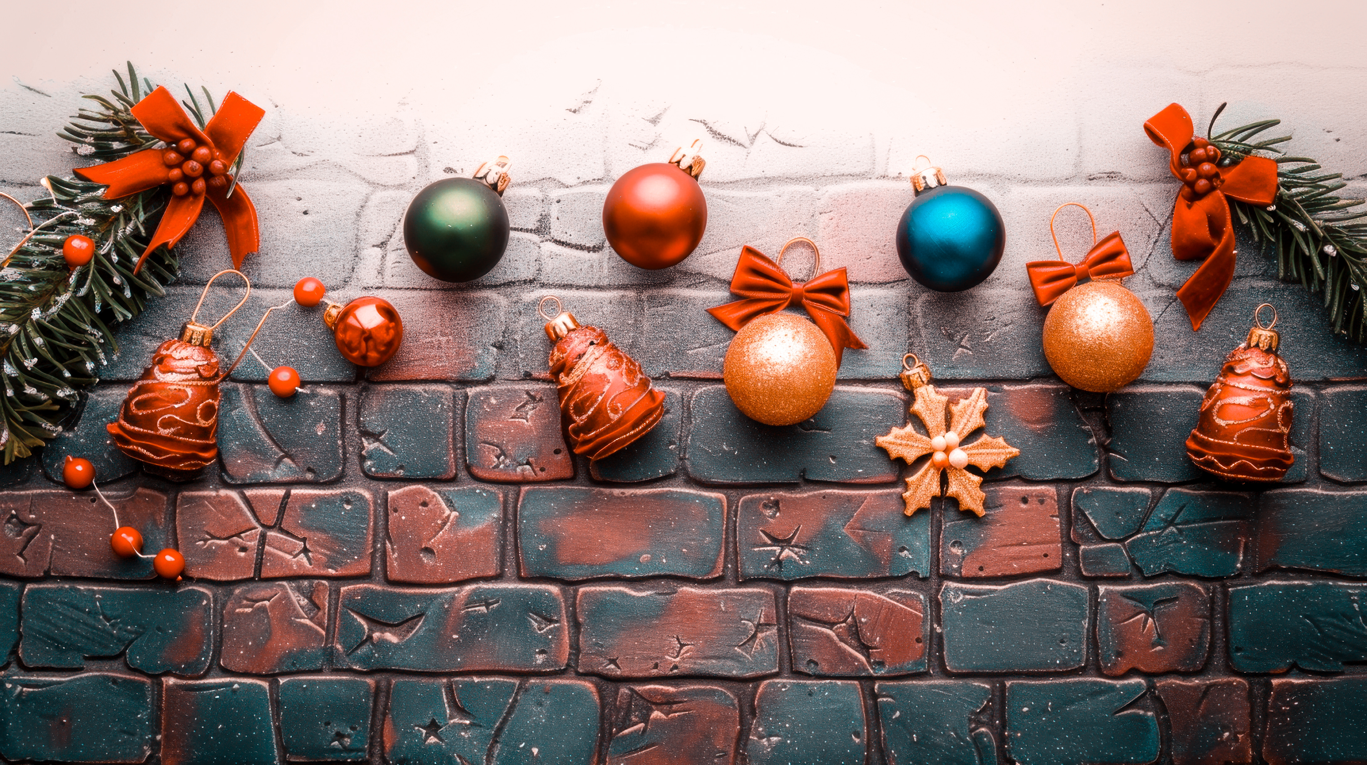 レンガ壁に並ぶクリスマスオーナメントと松の枝飾りのAI画像素材(フリー)