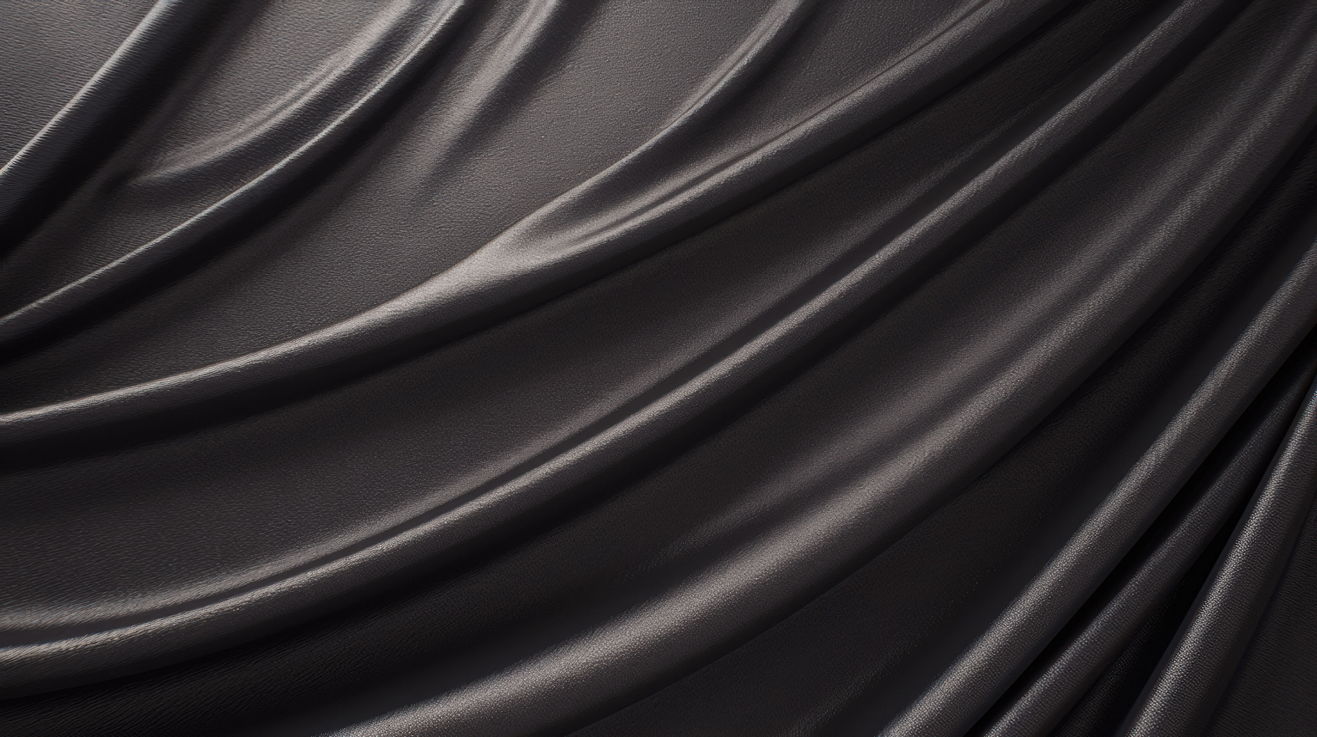 AIで生成した黒いサテン生地のドレープを表現した画像素材です。光沢のある素材が対角線状に何層にも波打ち、深い黒から明度の高いグレーへと段階的に色が変わります。光が繊維に沿って流れるような質感を表現しており、高級感のある素材感が必要なデザインやファッション関連、背景素材として活用できます。