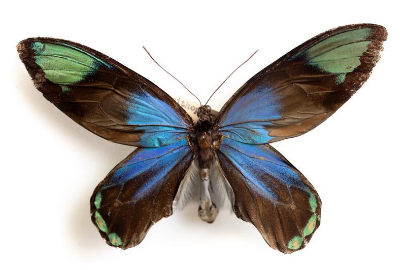青色と緑色が鮮やかなビクトリアレギナトリバネアゲハの昆虫標本の写真素材です。茶色の身体から左右対称に広がった翅には、上翅に緑色、下翅と中央部に深い青色が放射状に広がり、複数の緑色の斑点が翅の周縁に点在しています。科学教育、昆虫図鑑、自然史博物館関連のコンテンツやデザイン素材におすすめです。
