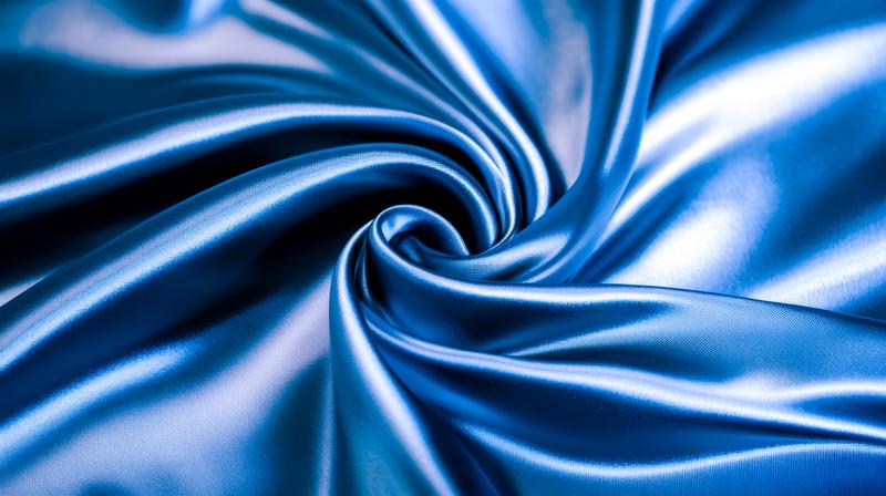 AIで生成した青いサテン生地の画像素材です。中央に向かって渦を巻くドレープと、表面を走る白い反射光が目を引く。ファッションやインテリア関連のデザイン背景素材としてどうぞ。