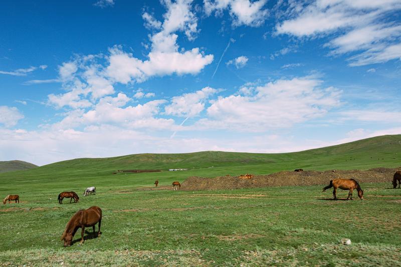 モンゴルの広大な草原で放牧される馬たちの写真素材です。茶色や白黒の馬が群れをなして草を食べており、背景には緑色の丘陵地が連なり、青い空には白い雲が浮かんでいます。遊牧民の生活と自然景観を象徴する光景で、旅行記事や自然景観、広告素材などにおすすめです。