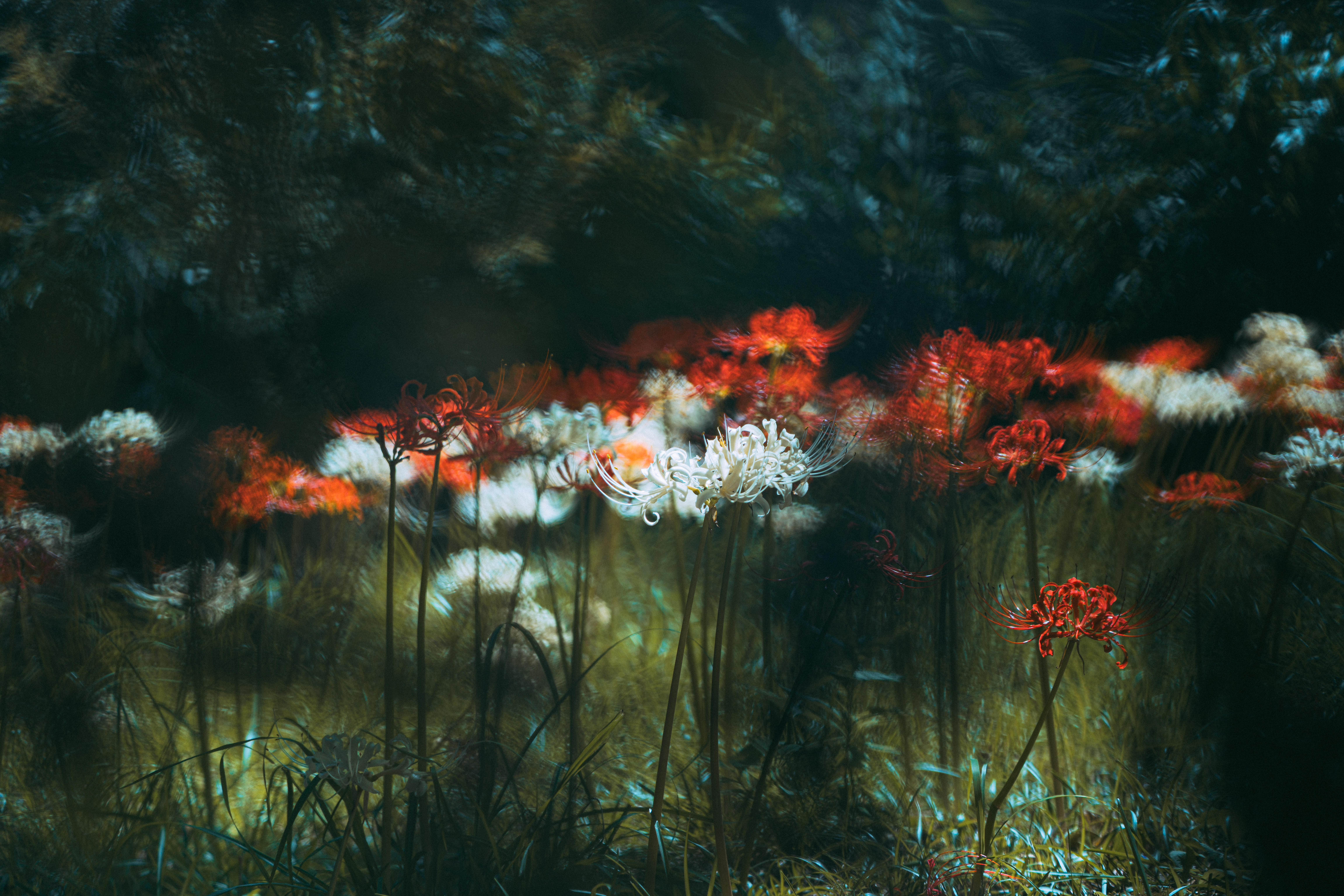 赤と白の彼岸花が群生する花畑の写真素材です。細い緑の茎の先に赤橙色と白色の花弁が放射状に開き、多数の花が手前から奥へ続く光景を捉えています。秋の季節素材やお彼岸関連の記事、和風デザインなどにおすすめです。