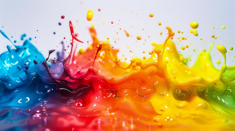 複数の色が激しくぶつかり合い液滴が散乱するカラフルな抽象的ペイントの画像