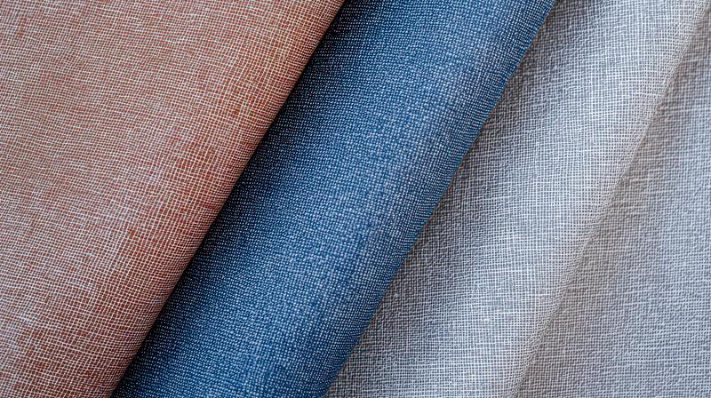 AIで生成したリネン調の布地3枚がロール状に重なった画像素材です。テラコッタ・ブルーグレーなど3色が斜めに並び、細かい織り目が写っている。インテリアやアパレルの素材紹介、カタログデザインにおすすめです。