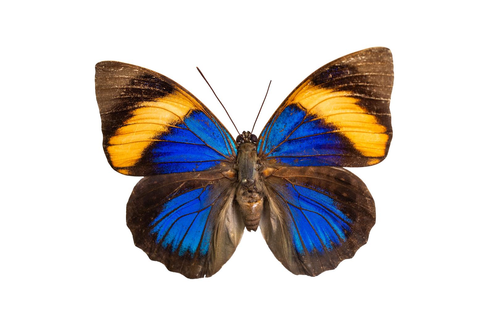 ナルキススミイロタテハのアマゾン産標本の写真素材です。黒褐色の翅に青と黄橙色の鮮やかな模様が左右対称に広がり、長い触角が立ち上がった状態で標本化されています。南米アマゾン地域を原産地とする美しい蝶の貴重な昆虫標本で、昆虫図鑑や自然科学関連のWebサイト、教育用コンテンツにおすすめです。