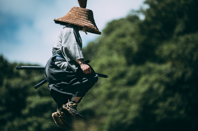 飛び上がる用心棒の写真素材です。白い麻混素材の上衣に紺色の袴を着け、藁編みの円錐形の笠をかぶった男性が両腕を広げて宙を舞い、ダイナミックなアクションポーズを決めています。時代劇や侍のコンテンツ、歴史関連のWebサイトやブログなどにおすすめです。