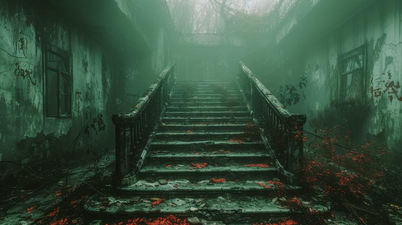 AIで生成した霧に包まれた廃墟の階段の画像素材です。緑に変色した石造の階段が奥へ伸び、劣化した壁にはつる植物が絡み、薄緑色の苔むした欄干が朽ちかけています、階段にはオレンジ色の落ち葉や枯れ枝が散在。ホラーゲーム、小説の挿絵、背景素材などに活用できます。