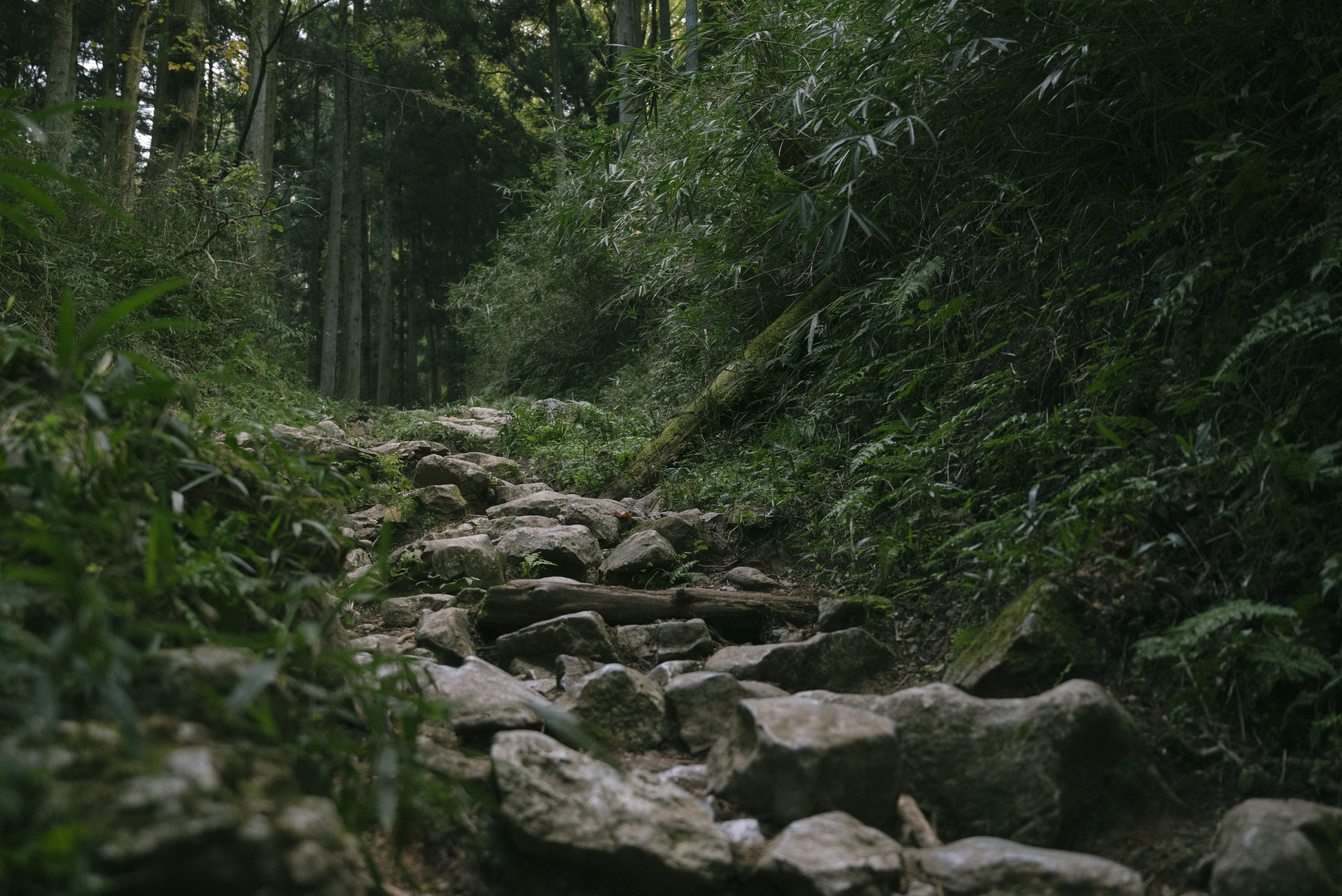 伊吹山一合目の登山道の写真素材です。茂った樹木と竹林に囲まれた道では、足元に落ち葉や岩が積み重なり、苔が生した石が至る所に散在しています。日本百名山の伊吹山の自然豊かな登山風景として、登山やハイキング、自然散策の紹介、山岳地帯の季節コンテンツなどにおすすめです。
