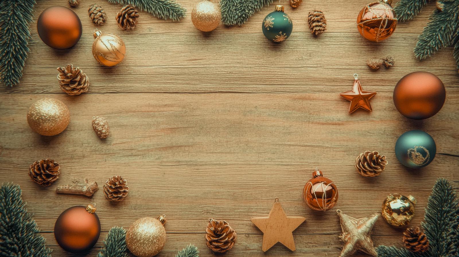 AIで生成したクリスマスオーナメントを飾ったテーブルの画像素材です。木製テーブルにブロンズやゴールドのボール、星型装飾、松枝、松ぼっくりがバランスよく配置されています。クリスマスシーズンのテーブルコーディネートやSNS投稿の背景などにおすすめです。