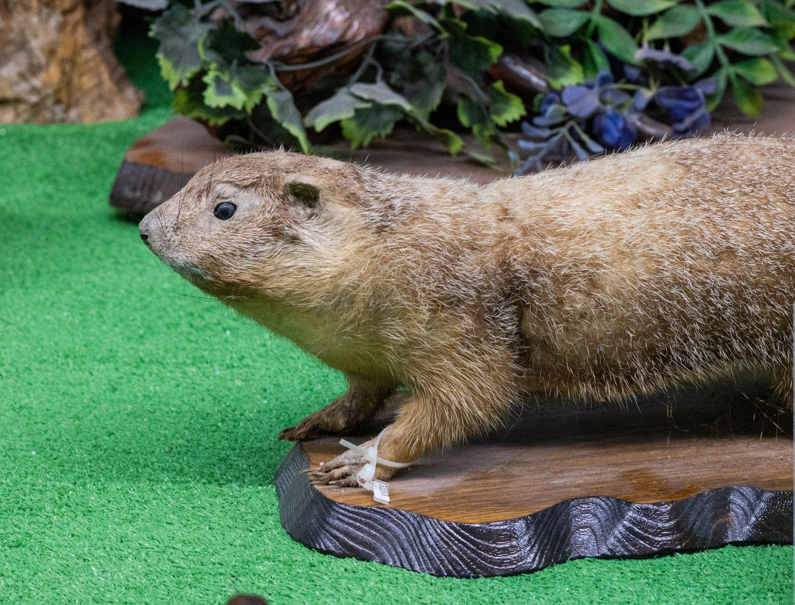 博物館に展示されたマーモットの剥製の写真素材です。茶色い毛並みを持つマーモットが緑色のマット上に横たわり、詳細な形態が観察できます。自然史博物館の展示紹介、動物学習教材、科学館のWebサイト制作などにおすすめです。