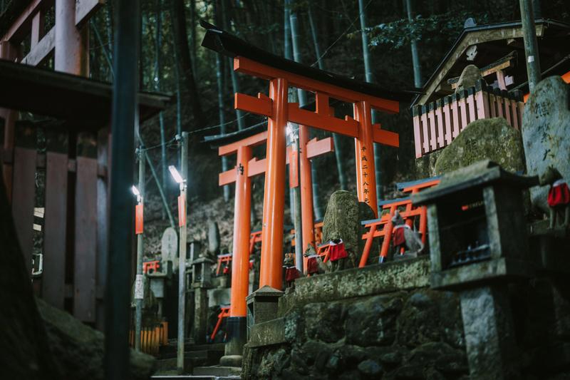伏見稲荷大社の参道に並ぶ朱色の鳥居道の写真素材です。竹林に囲まれた参道に大小の鳥居が連なり、石灯籍には赤い布が結ばれています、昼間の明るい光が建造物に当たり、鳥居トンネルが幽玄な雰囲気を醸し出しています。京都観光や神社参詣、日本文化の紹介などにおすすめです。
