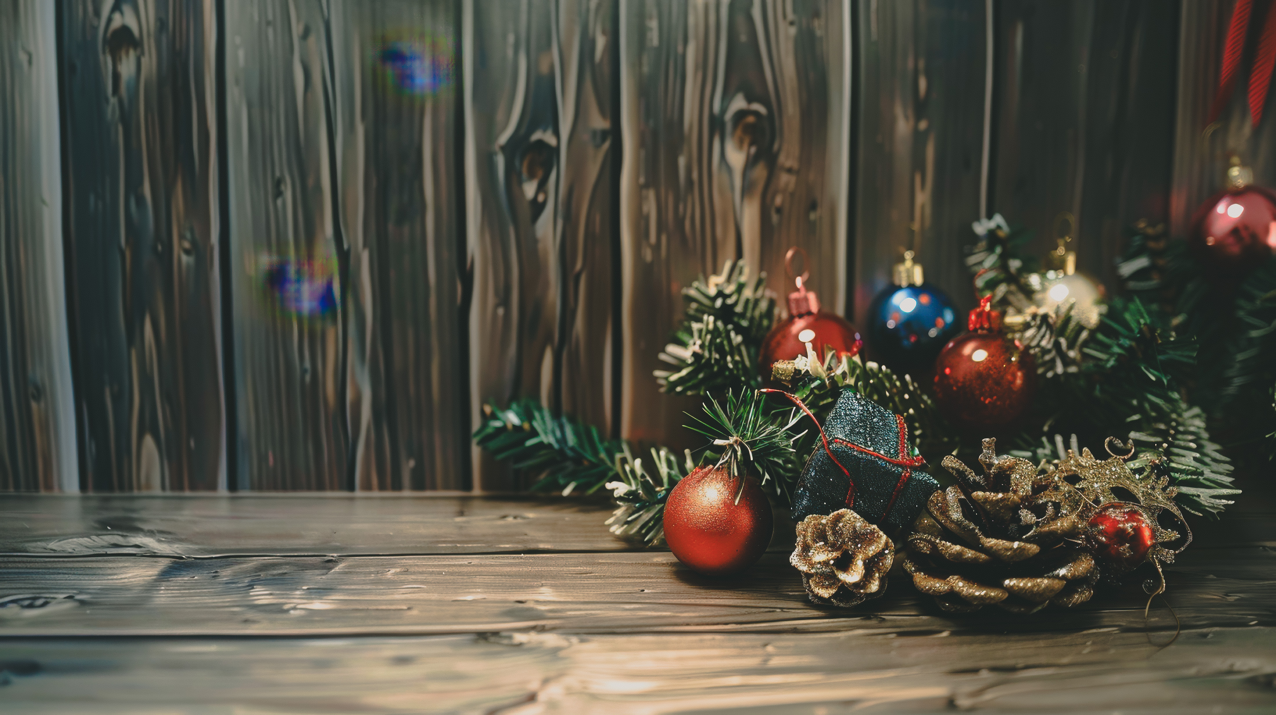 松ぼっくりと赤いオーナメントが彩るクリスマスの木目テーブルのAI画像素材(フリー)