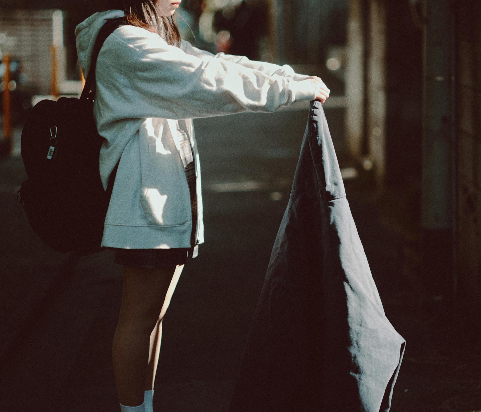 放課後の通学路でジーンズを持ち上げる女子高生の写真素材です。グレーのパーカーを羽織った女性が、購入したと思われるデニムパンツを両手で掲げて示しており、背景には暗い路地が広がっています。学生生活や青春の思い出、ショッピングシーン、ブログやSNSの青春カテゴリーコンテンツなどにおすすめです。