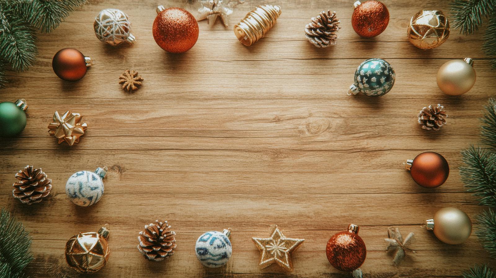 木製テーブルに並べたクリスマスオーナメントと松ぼっくりのAI画像素材(フリー)