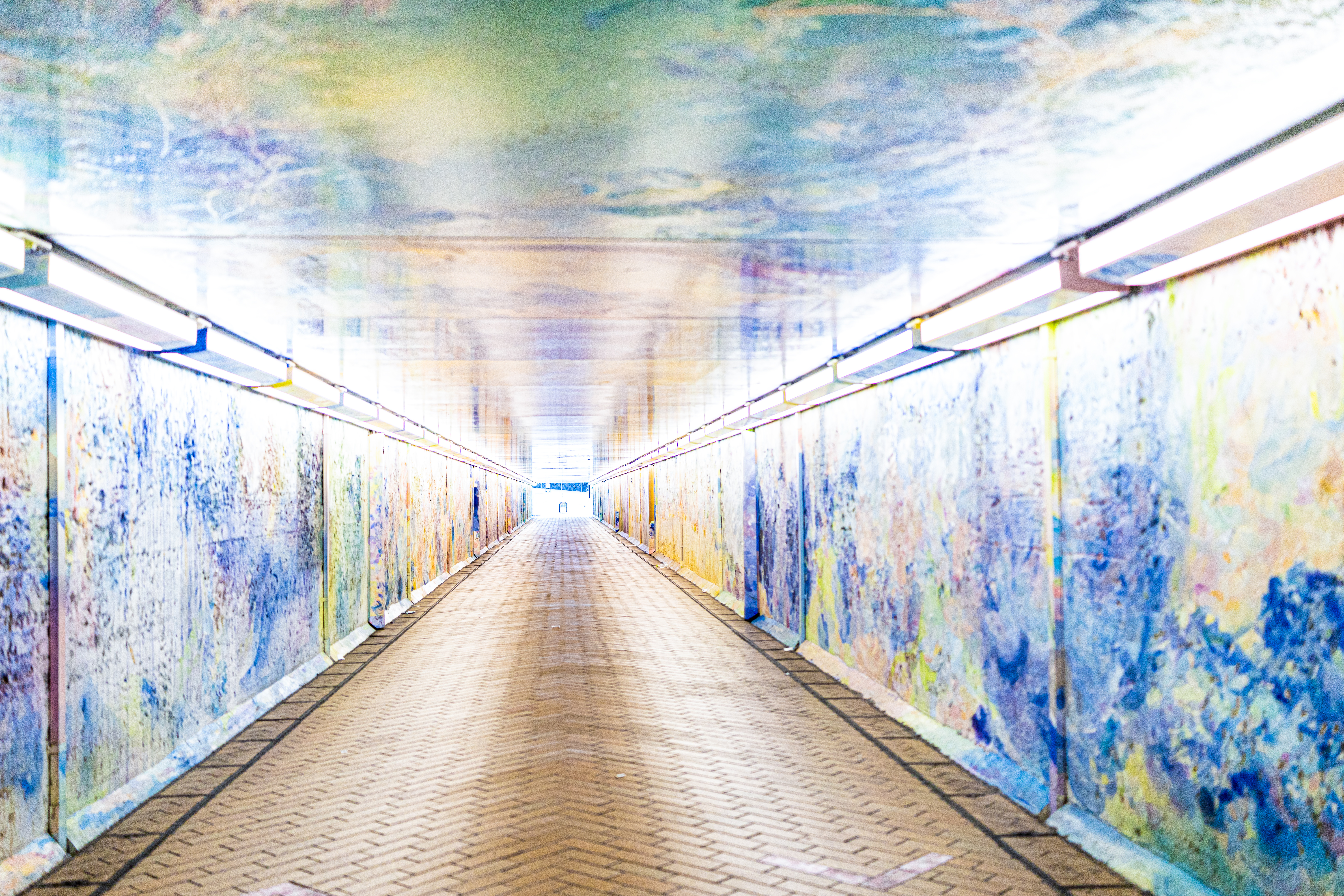池袋のウイロード(雑司が谷隧道)の地下通路の写真素材です。白と青を基調としたタイル壁が両側に続き、蛍光灯が一直線に配置された天井、茶色いタイル舗装の床が奥へまっすぐ伸びています。駅と駅を結ぶ近道の紹介、商業施設のコンテンツ制作などにおすすめです。