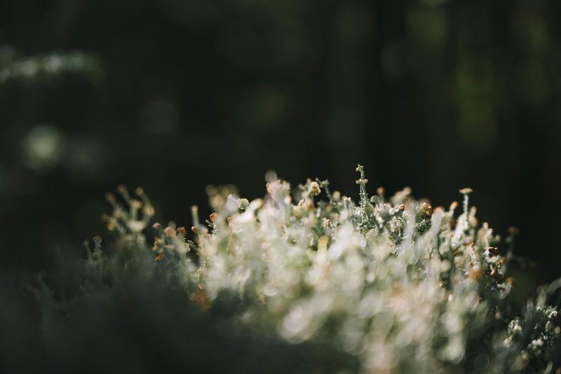 蓼科山の木々に潜む小さな苔の写真素材です。白く粉を吹いたような苔が岩や木の表面に群生し、細い茎と小さな花のような構造が密集している様子をマクロ接写で捉えた作品。山登りやトレッキング、自然観察、植物関連のWebサイトやブログ素材などにおすすめです。