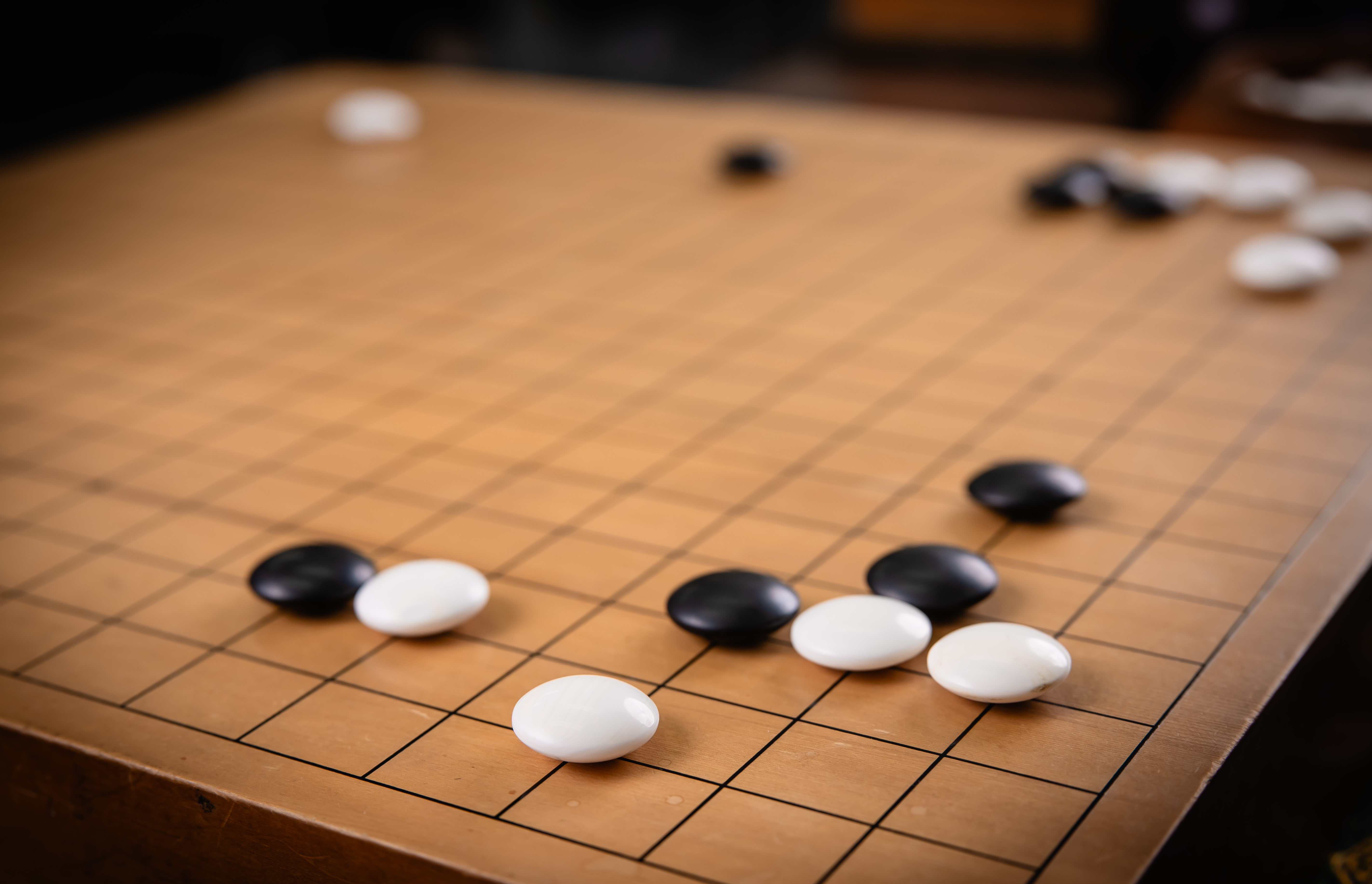 囲碁の碁盤上で黒石の横ツケにより攻めを仕掛ける場面の写真素材です。木製の碁盤に黒石と白石が配置され、黒石による戦術的な打ち方が展開されており、複数の碁石がボードの各所に置かれています。囲碁の対局風景やボードゲーム関連のコンテンツ、日本文化や伝統遊技の紹介などにおすすめです。