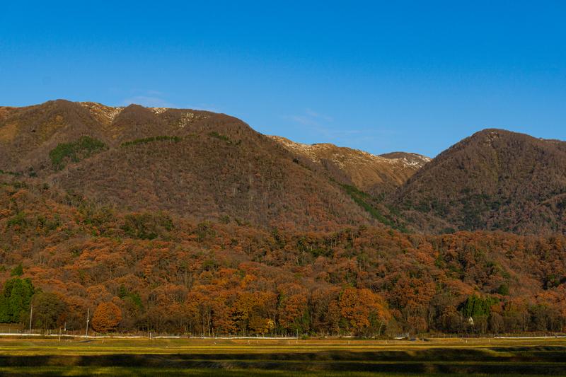 秋の終わりを告げる山里の風景の写真素材です。紅葉した雑木林が斜面を覆い、オレンジ色や茶色に染まった落ち葉が山全体に広がり、谷間には田んぼが見えています。背景には澄んだ秋空が広がり、観光や旅行、季節素材、田舎風景などのコンテンツ制作に最適です。