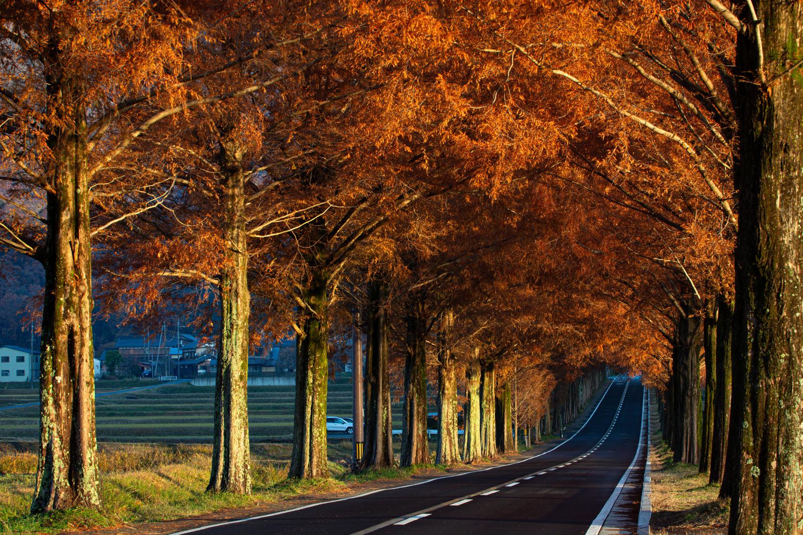 秋のメタセコイア並木道の写真素材です。両側に立つ落葉樹の幹から枝が広がり、褐色に染まった葉が上空で交差するトンネル状の並木道で、奥へ向かう黒いアスファルト道路の両脇に白線が引かれています。秋の季節素材や旅行・ドライブ関連のコンテンツ制作などにおすすめです。