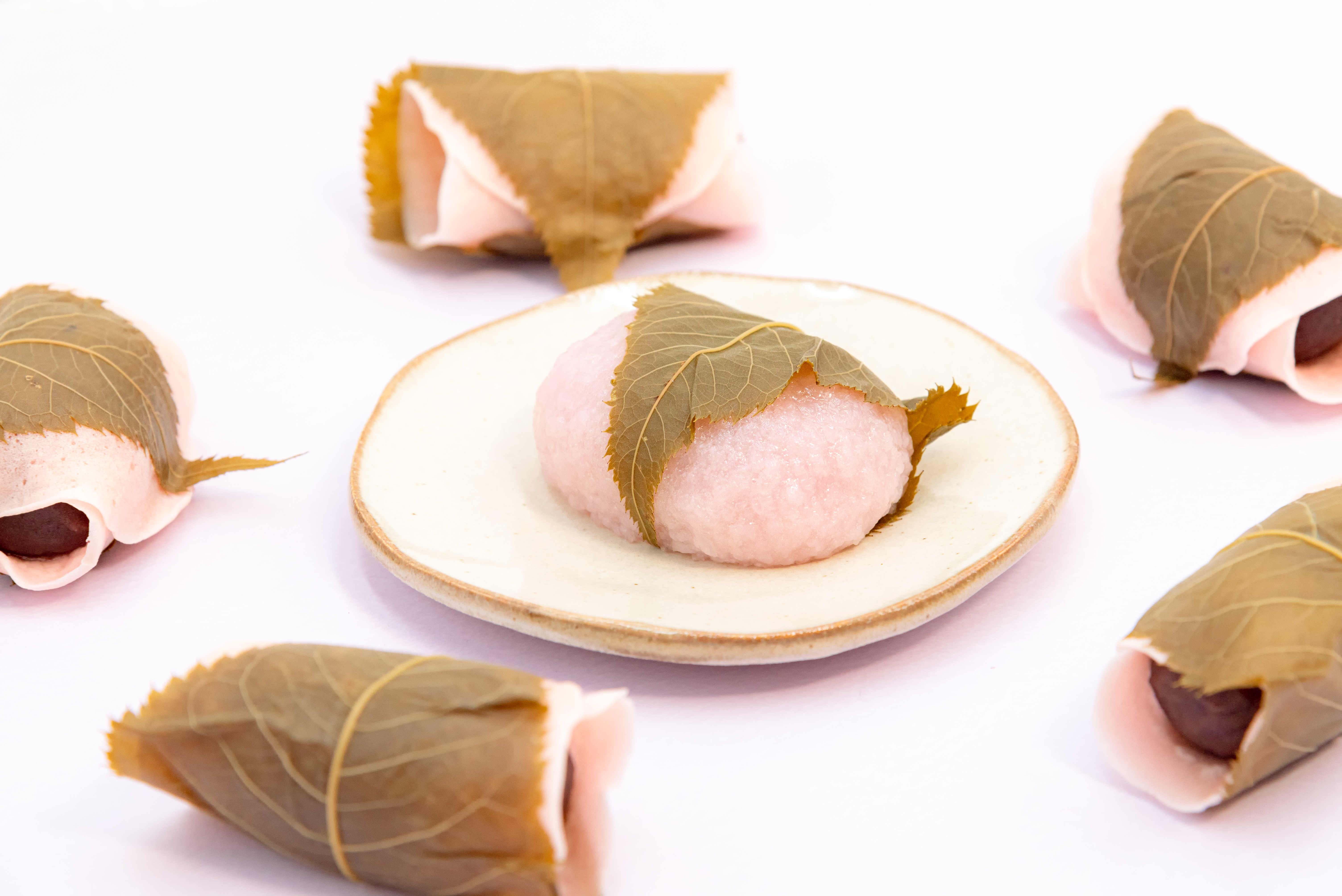 Kanto-style sakura mochi surrounding Kansai-style sakura mochi
