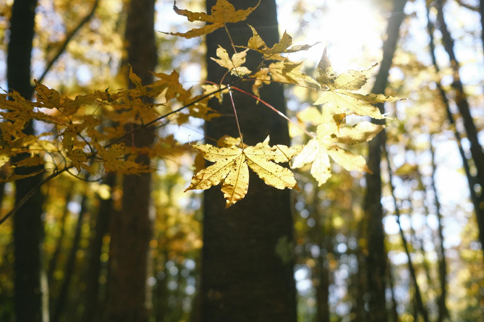 大菩薩嶺の秋景色、木漏れ日に照らされた楓の葉の写真素材です。黄色く色づいたモミジの葉が枝先に付き、背後の木立から差し込む陽光を透かしており、葉脈や色合いが明瞭に映っています。山岳風景やハイキングガイド、紅葉シーズンの観光コンテンツ、秋の季節素材などにおすすめです。