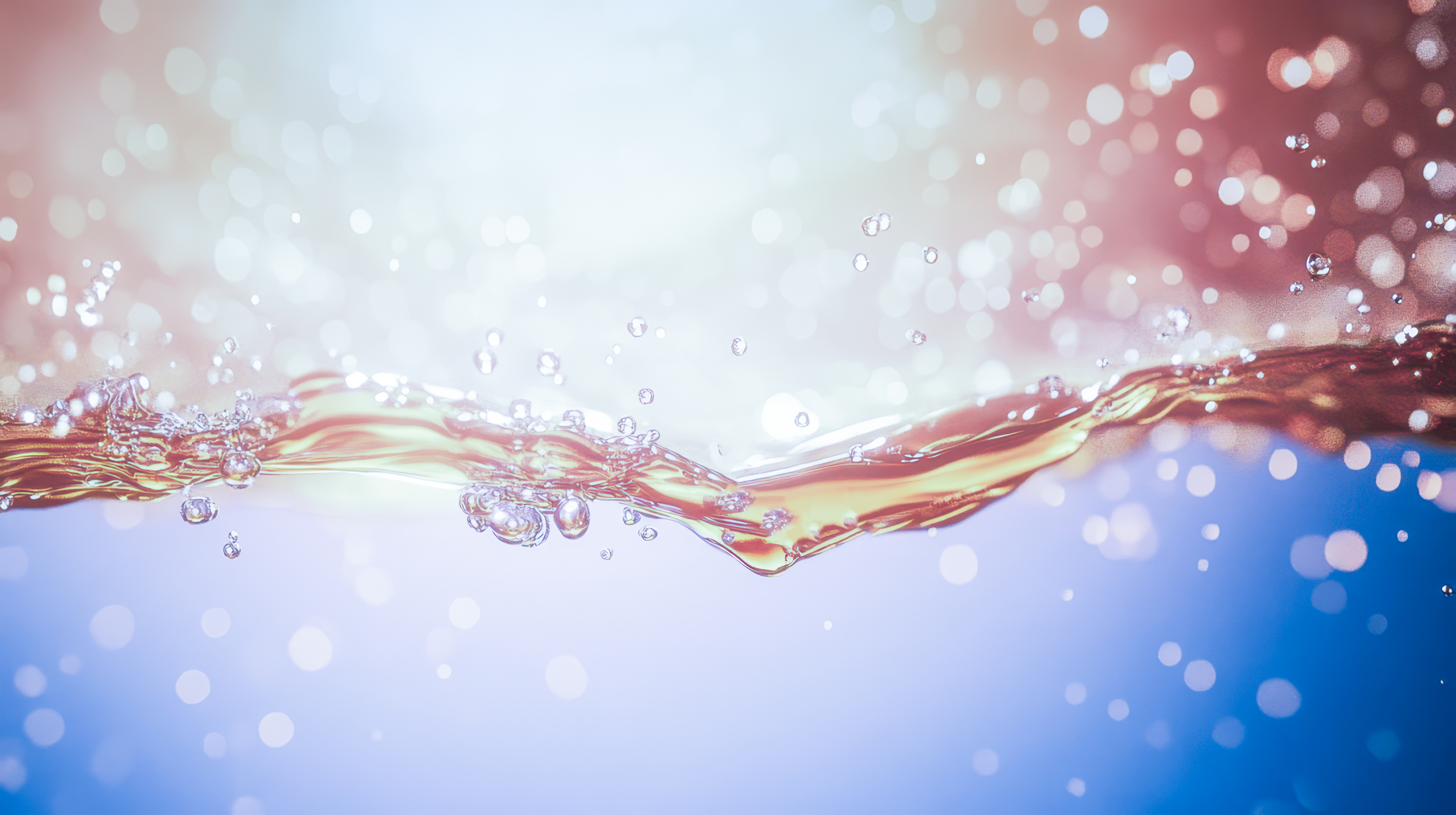 ピンクと青のグラデーション水面に弾ける透明な気泡のAI画像素材(フリー)