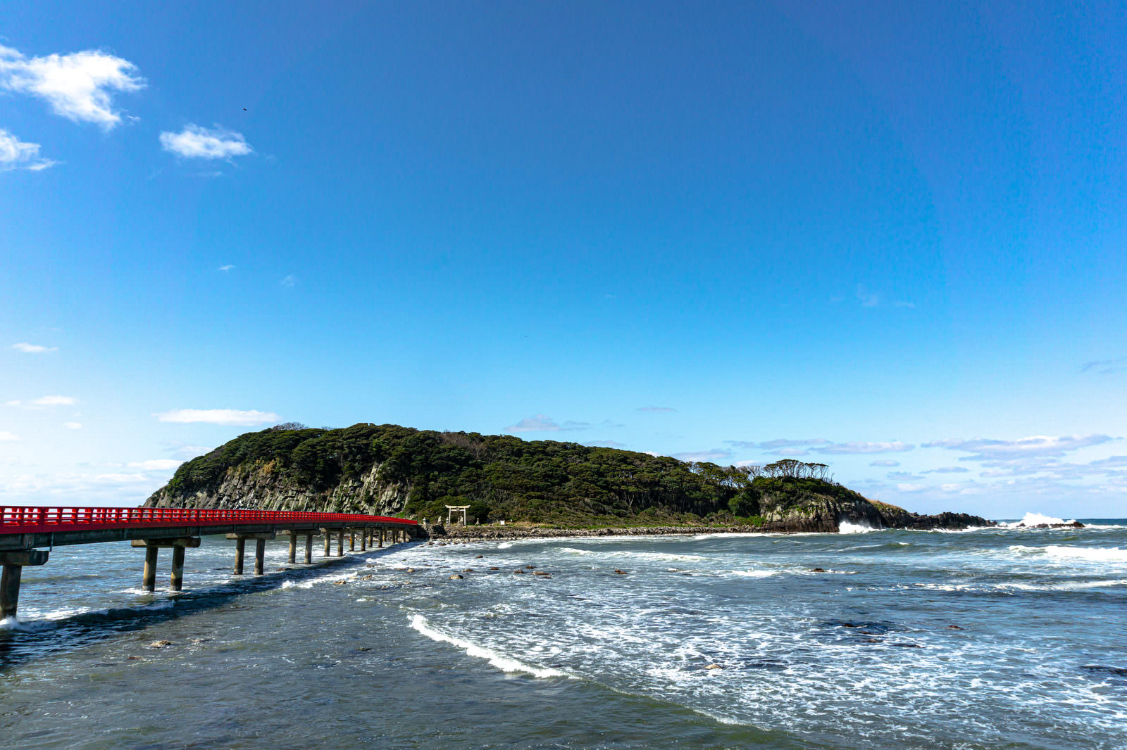福井県の雄島と本土を結ぶ赤い橋の風景写真素材です。緑に覆われた島の周囲には白く泡立つ波が押し寄せており、赤色の橋が海上を横切って島へ向かっています。この神聖な景観は観光地の紹介や自然風景、旅行関連のコンテンツなどに活用できます。