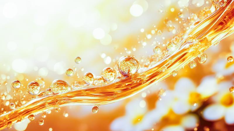 AIで生成した黄金色の液体を滑り落ちる水滴のきらめきを表現した画像素材です。琥珀色の水滴が黄金色の液体の上を流れ落ち、光に照らされながら輝く様子が映されており、液体の粘性や流動性がリアルに表現されています。美容液やエッセンスのプロモーション、スキンケア関連のデザインなどに活用できます。