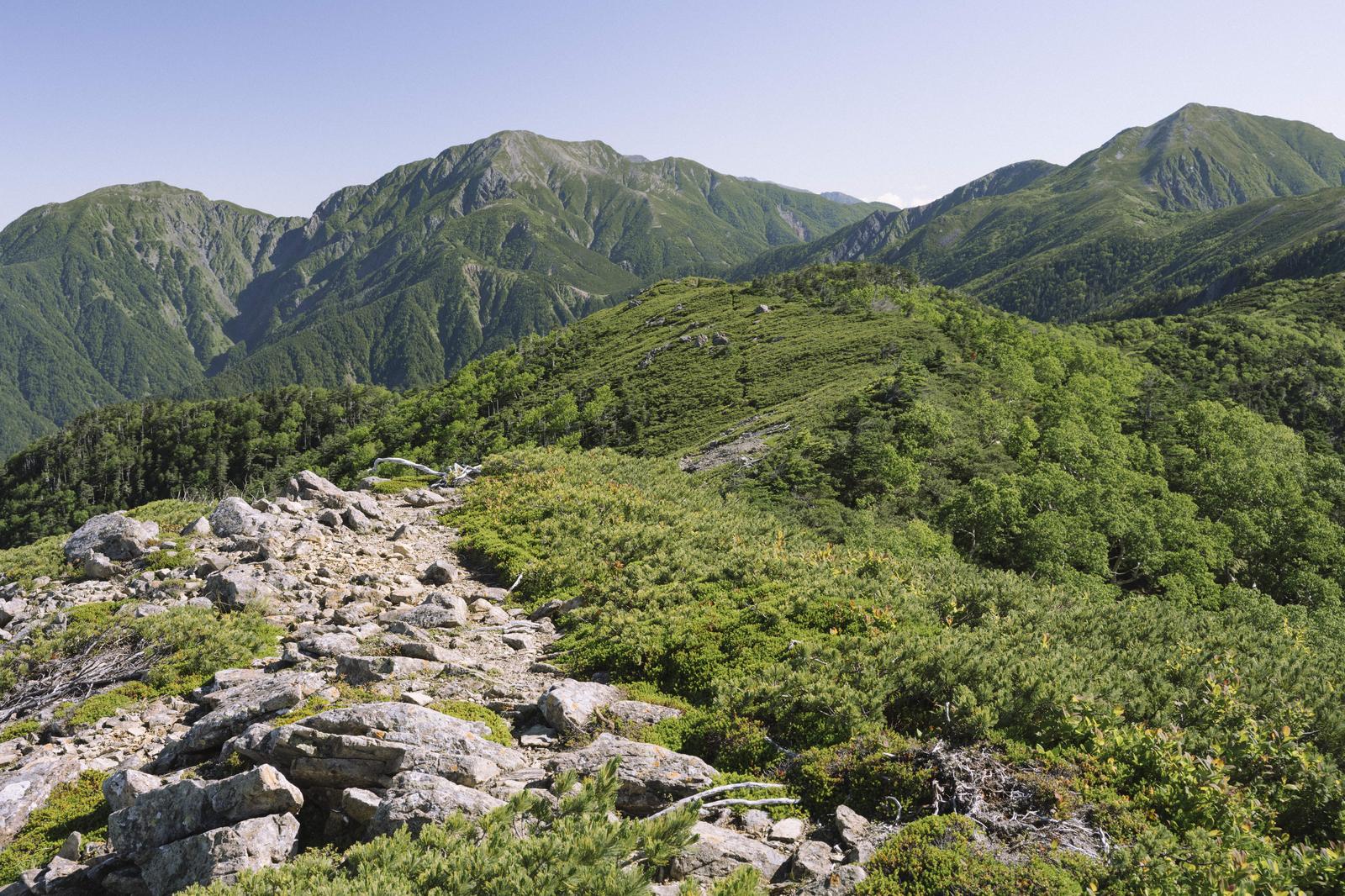 仁田岳から望む聖岳、上河内岳、兎岳の山並みの写真素材です。手前の尾根には岩と低木が散在し、背後には深い谷を挟んで3つの峰が連なり、谷間や山腹は濃い緑の樹林に覆われています。登山ガイドや山岳旅行関連のコンテンツ、南アルプスの紹介資料などにおすすめです。