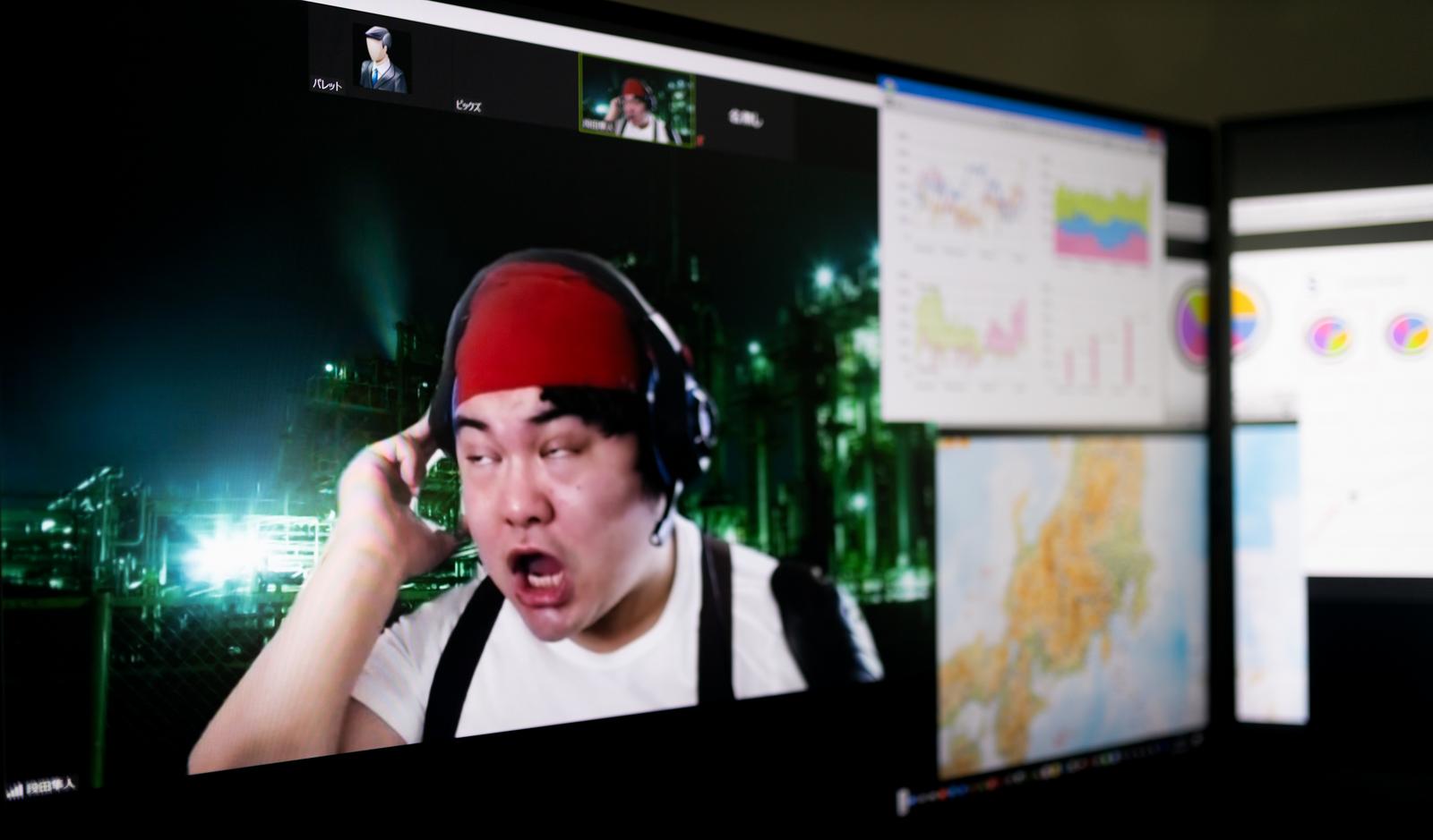 オンライン会議中に困った表情で焦る男性の写真素材です。赤いキャップと黒いヘッドフォンを装着した男性が、白目を向きながら口を開けて緊張した様子を見せており、背景のモニターには会議の参加者やグラフが映っています。コメディ系コンテンツやネタ画像、SNS投稿などに活用できます。
