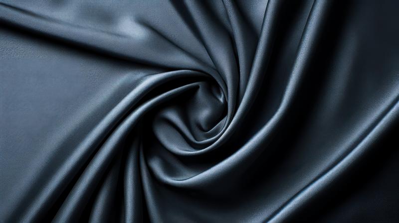 サテン素材のドレープが渦状に折り重なる生地の写真素材です。黒とグレーの濃淡を帯びた滑らかな表面には光沢があり、立体的に折り畳まれた箇所では影が落ちて奥行きが生まれています。ファッションやテキスタイル、高級素材の紹介やカタログ制作などにおすすめです。