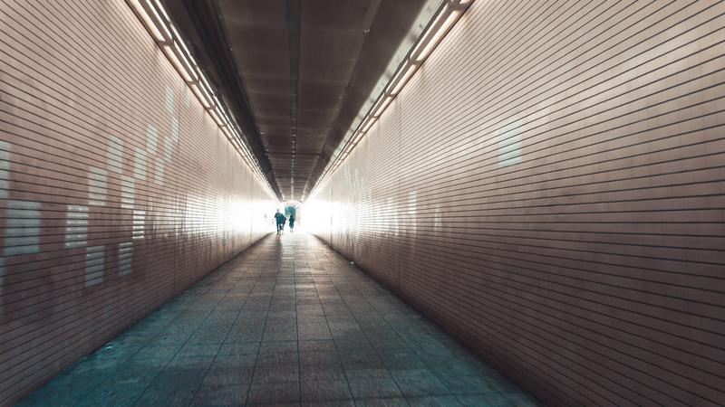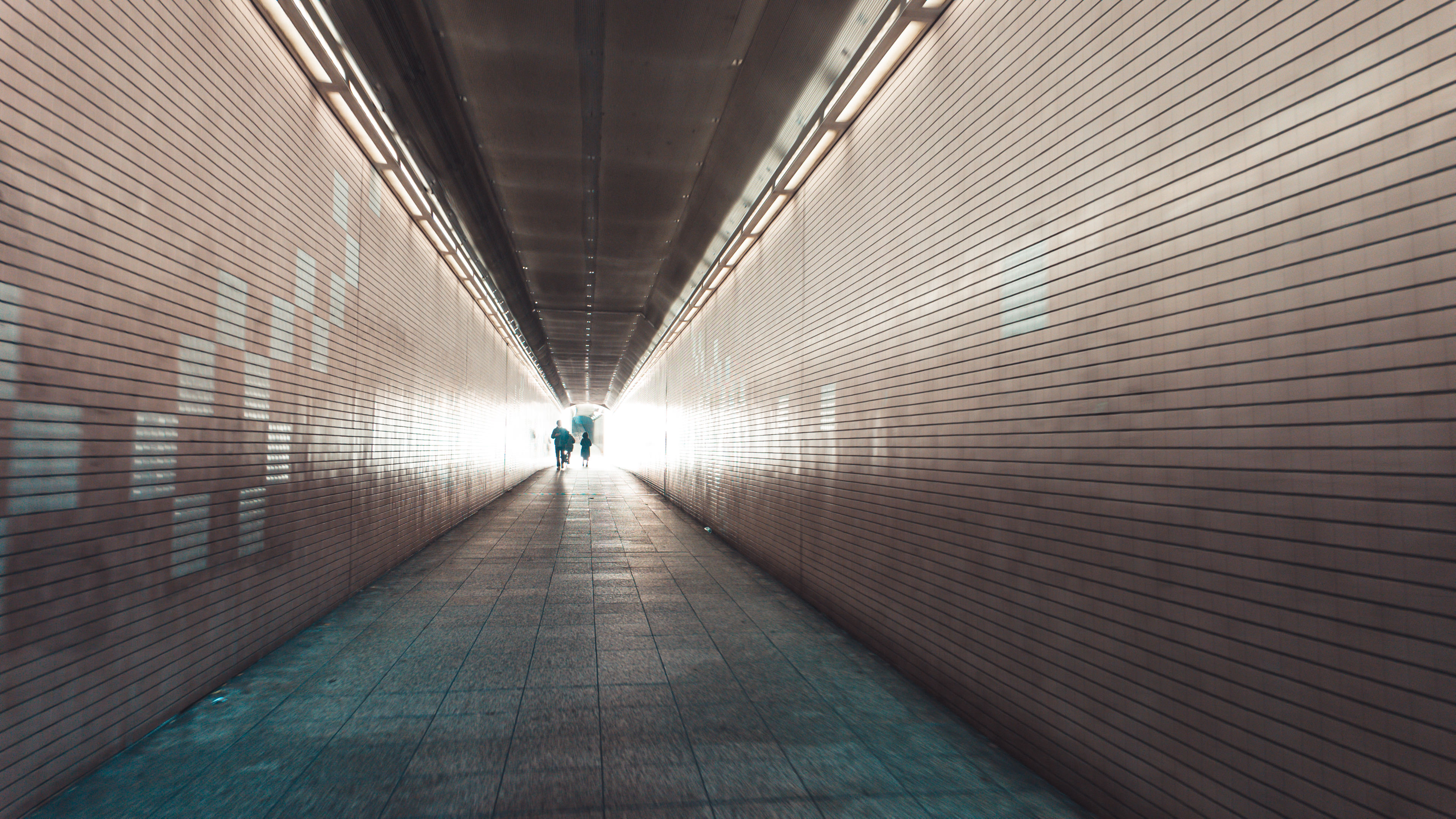 南池袋のびっくりガードの歩行者専用通路の写真素材です。鉄骨とコンクリートでできた長いトンネル状の通路で、両側の壁が規則的な線状の模様で覆われ、奥に向かって消失点が見えます、複数人が通路を歩いており、遠くから差し込む光により明るく照らされています。駅周辺やビジネス、都市風景のコンテンツなどにおすすめです。