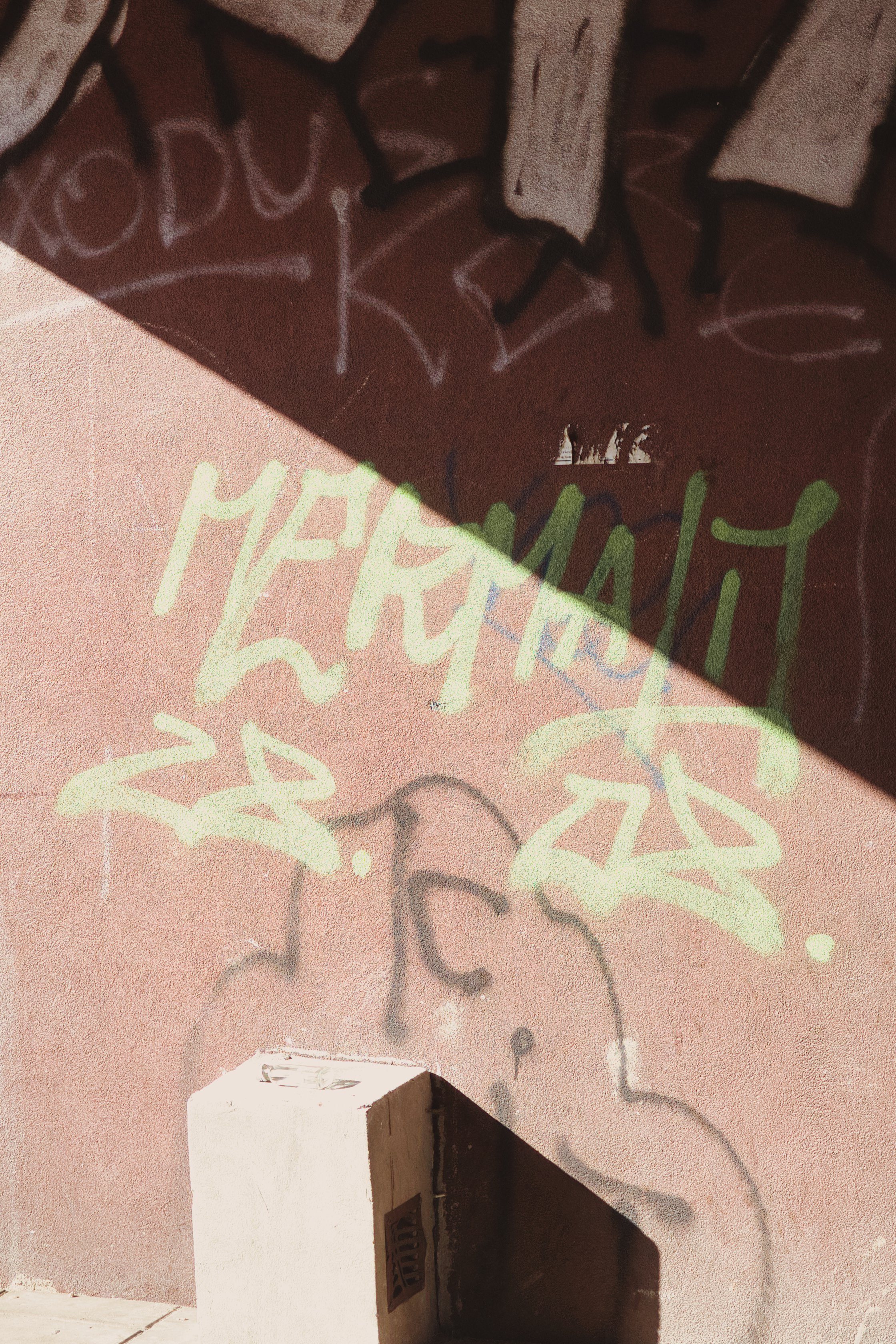 ポーランドのチェンストホバにある壁面のストリートアート作品の写真素材です。ピンク色とベージュ色の壁に黄緑色と淡いクリーム色で描かれた大型文字が日光に照らされており、城壁の一部と干された衣類も映り込んでいます。都市アート、ポーランド観光、ストリートカルチャー関連のコンテンツなどにおすすめです。
