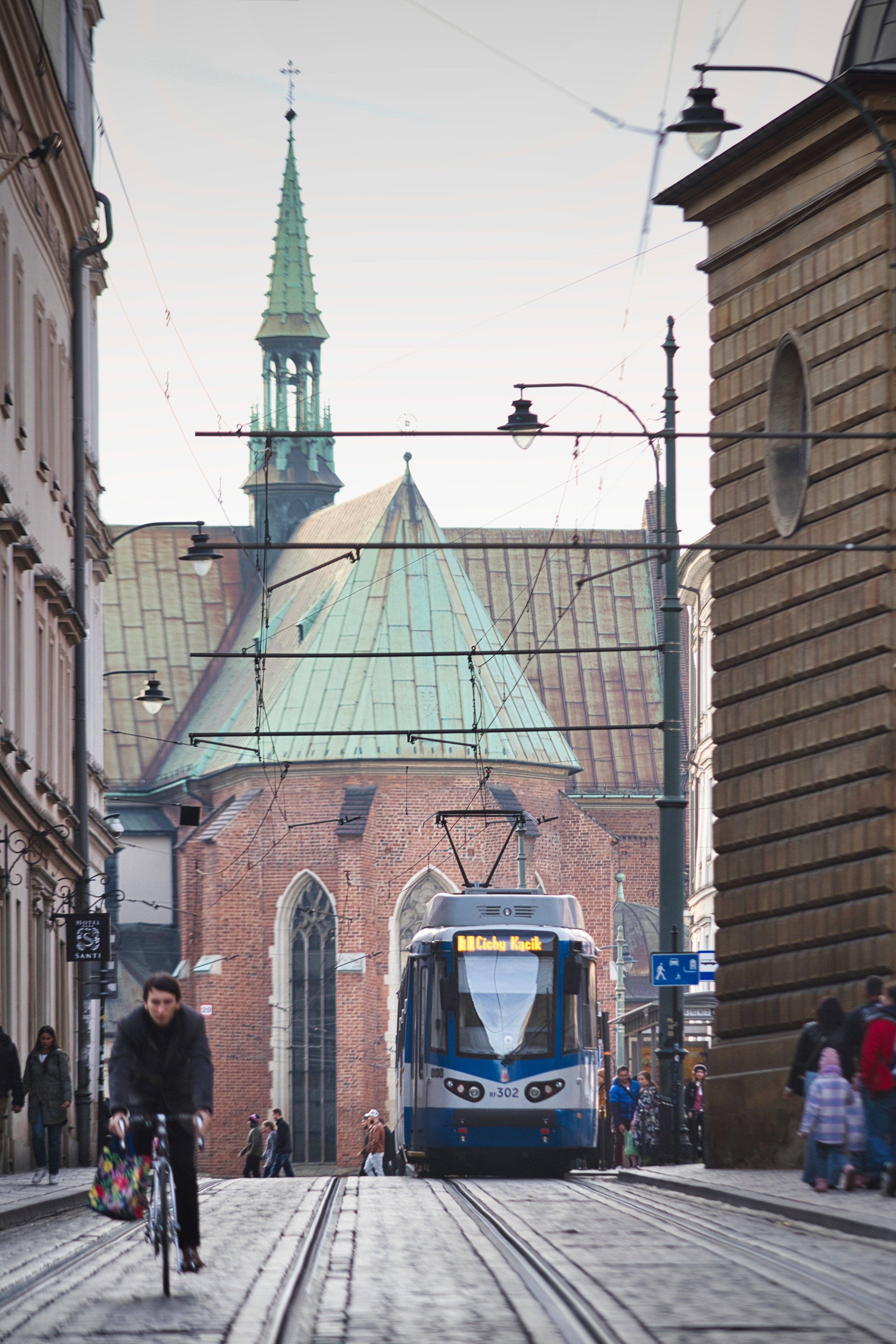 ポーランドの古都クラクフで路面電車が走る街角の写真素材です。青と白のトラムの前には自転車で移動する人や徒歩の通行人がおり、両脇にはゴシック様式のレンガ造り建築が立ち並んでいます、背景に緑色の屋根を持つ教会が見え、歴史ある街並みの風景が広がっています。欧州の古都の雰囲気と交通風景の記録におすすめです。