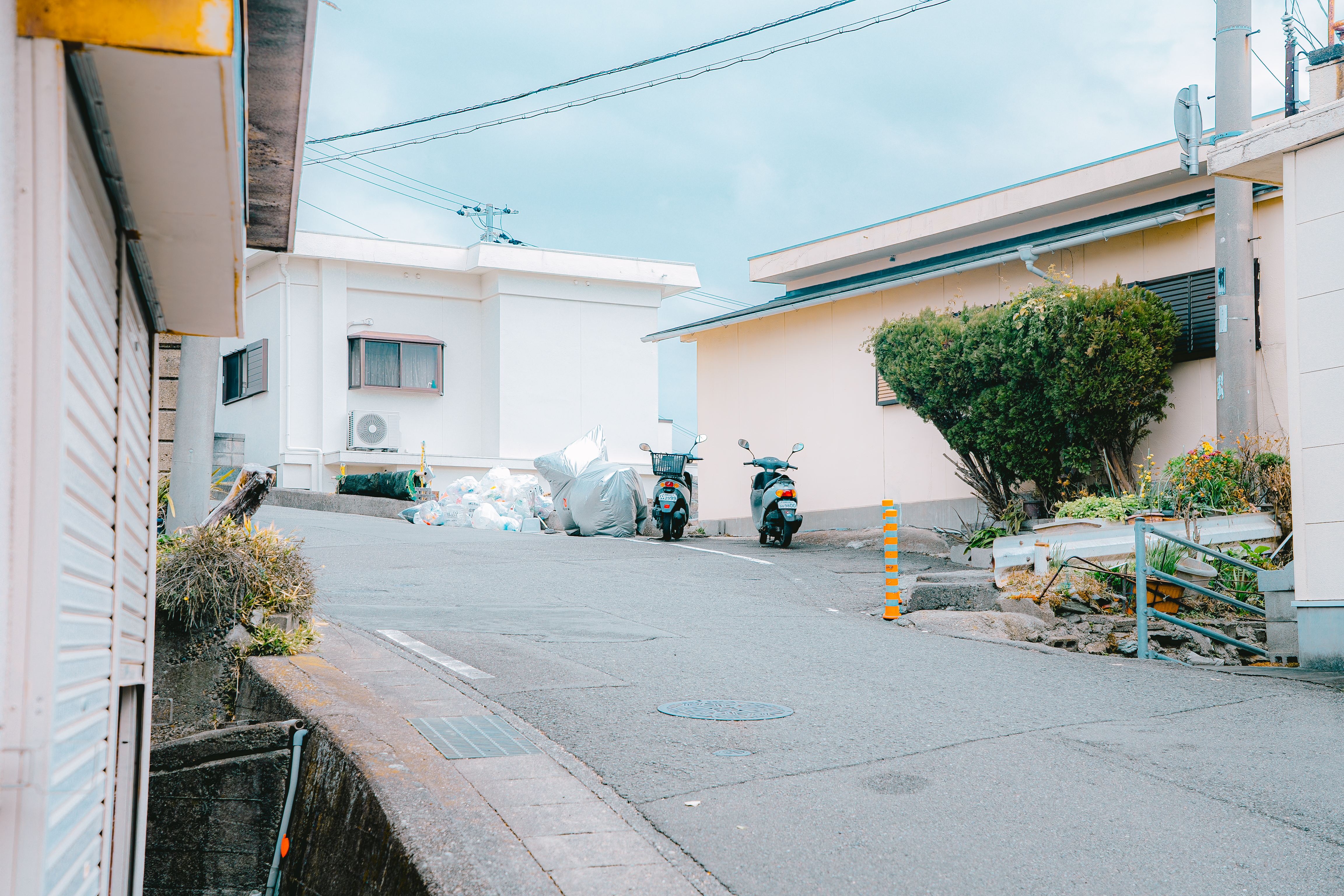 坂道の道路脇に停まる2台のスクーターの写真素材です。白い住宅が立ち並ぶ坂道の脇にゴミ集積所があり、その近くに青と黒のスクーターが並んで駐輪され、背景には緑の植栽と電線が見えています。日本の住宅街や路地裏の風景、生活シーン素材などにおすすめです。