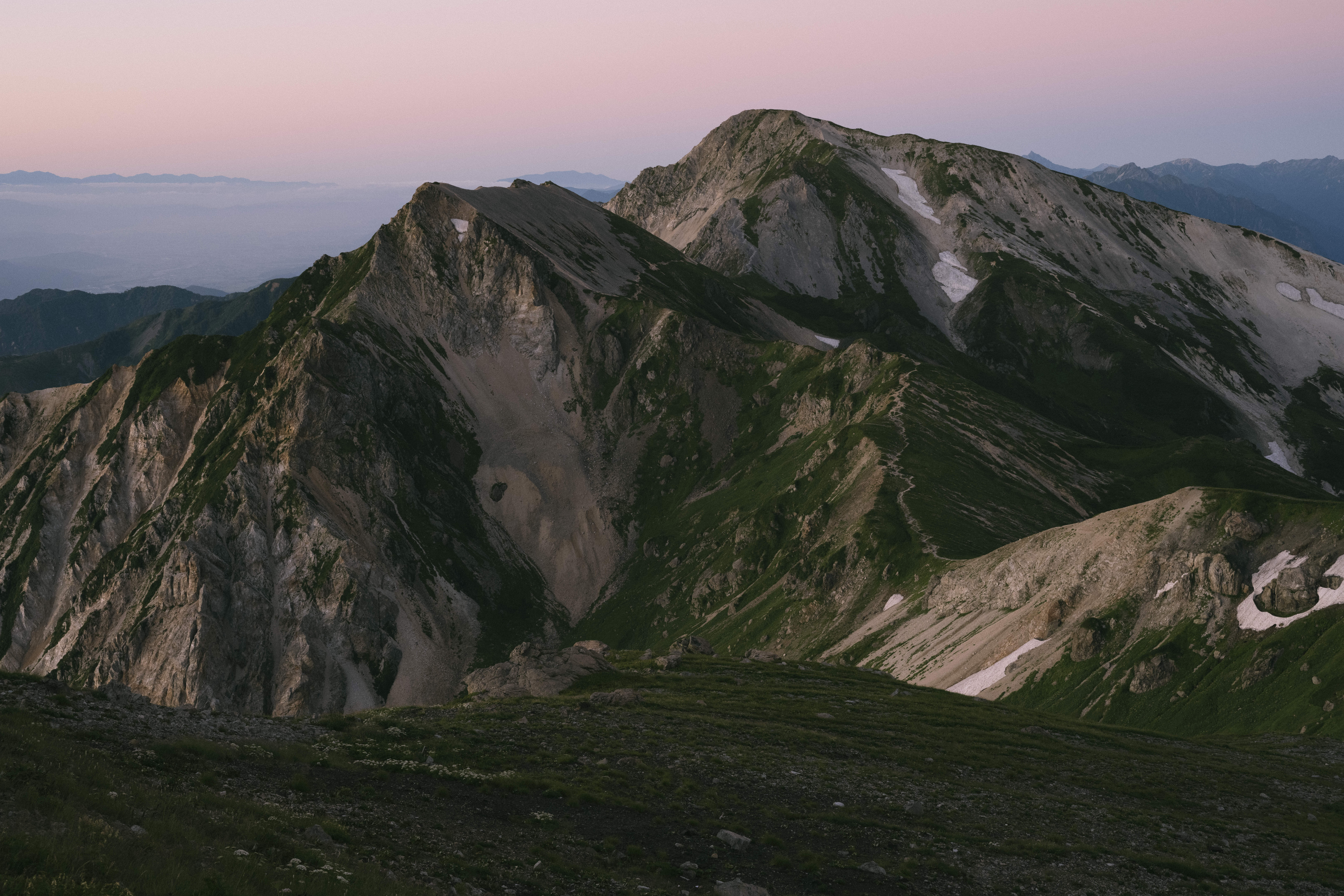 北アルプス白馬岳周辺の早朝風景の写真素材です。手前の草地から見上げた複数の山頂の稜線は露出した岩肌が白く輝き、斜面には緑の植生が深く色づき、遠景の山々は夜明け前の薄紫色に霞んでいます。登山ガイドや山岳雑誌、旅行ブログなど高山の自然コンテンツに最適です。