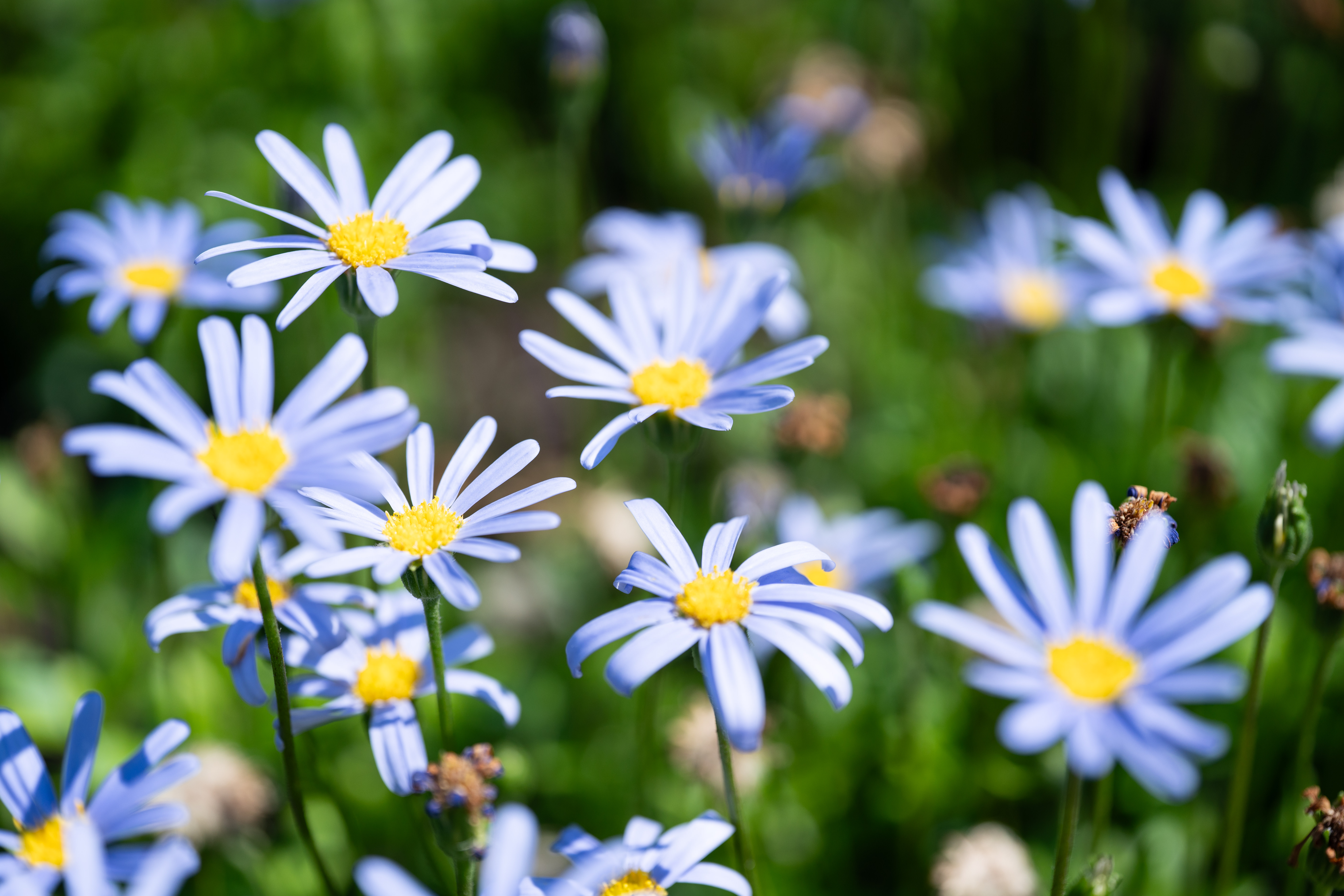 ブルーデージーが庭いっぱいに咲き並ぶ写真素材です。水色の細い花びらと丸い黄色い花芯が近くからはっきり写っている。ガーデニングや春のイメージ素材におすすめです。