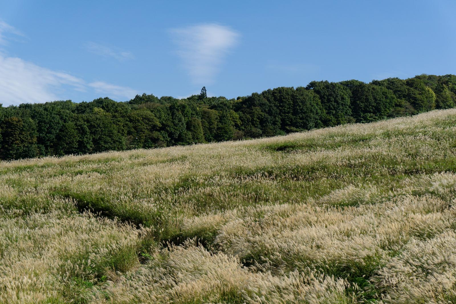 すすきが丘陵の斜面いっぱいに広がる草原の写真素材です。白く実った穂が風になびき、奥に広葉樹と針葉樹の混じる林が連なっている。秋の自然風景や季節感を伝えるコンテンツ制作にどうぞ。