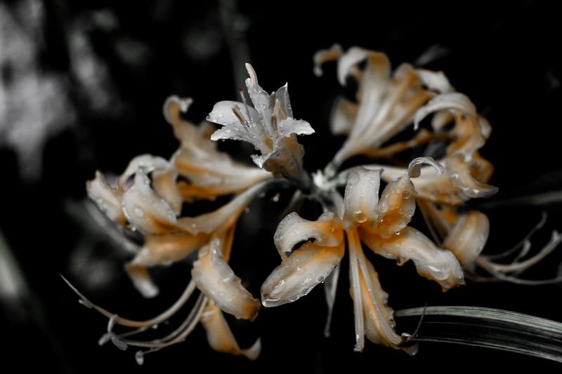 水滴のついた白い曼珠沙華をクローズアップで撮影した写真素材です。花びらにオレンジの筋が入り、雨に濡れた細かい水滴が花全体に光っている。秋の植物素材や、和のイメージが必要なデザインにおすすめです。