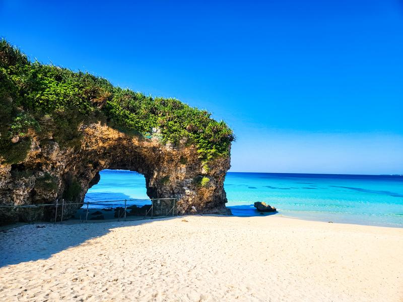エメラルドグリーンの海に架かる長い橋の写真素材です。白いコンクリート製の橋が広大なターコイズブルーの海を横切り、橋の上には複数の車が走行しており、遠方には島が見えています。観光や旅行関連のコンテンツ、沖縄や宮古島の紹介素材などにおすすめです。
