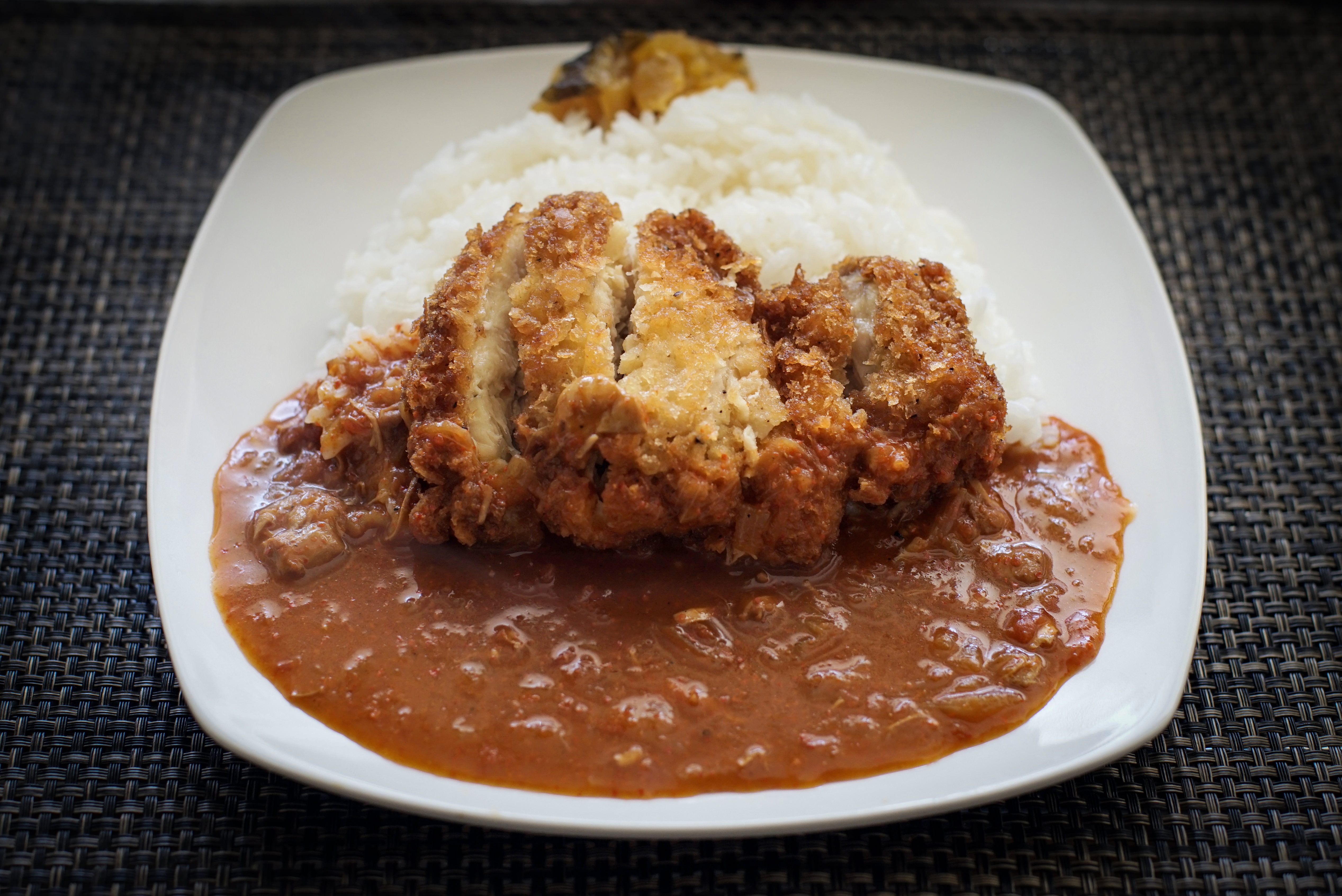 カツカレーの写真素材です。チキンカツを切り分けてカレールーにのせた、手作り感のある一皿。レシピブログや食堂メニューの掲載にどうぞ。