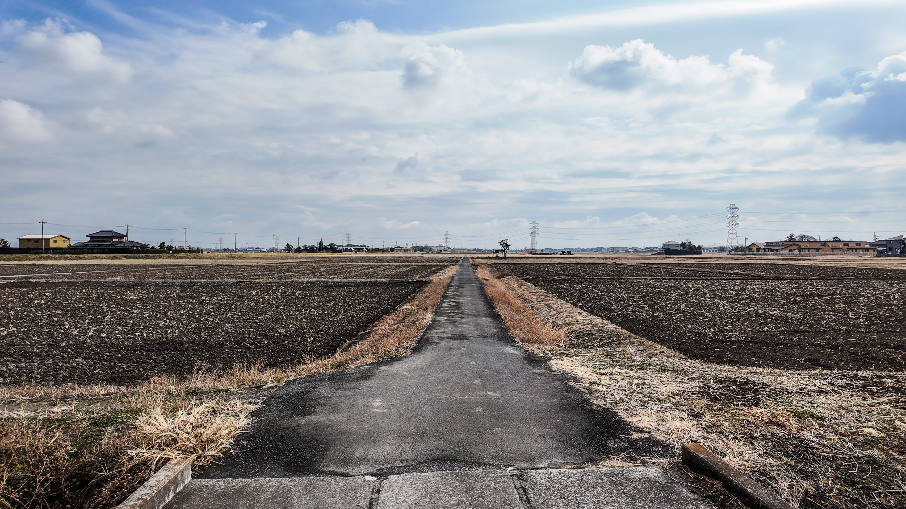 冬の農村を撮影した写真素材です。コンクリートの農道が地平線まで一直線に延び、両脇には耕された畑と枯れ草が広がっている。田舎の風景や農業・農村テーマのコンテンツにおすすめです。