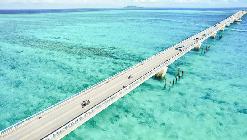 透き通ったエメラルドグリーンの海と白い砂浜の波打ち際の写真素材です。宮古島の浅瀬を空撮した画像で、濃い青緑色から薄い青に段階的に色が変わり、白い砂地が透けて見えています。旅行サイトやリゾート関連のコンテンツ、観光情報の制作などに最適です。