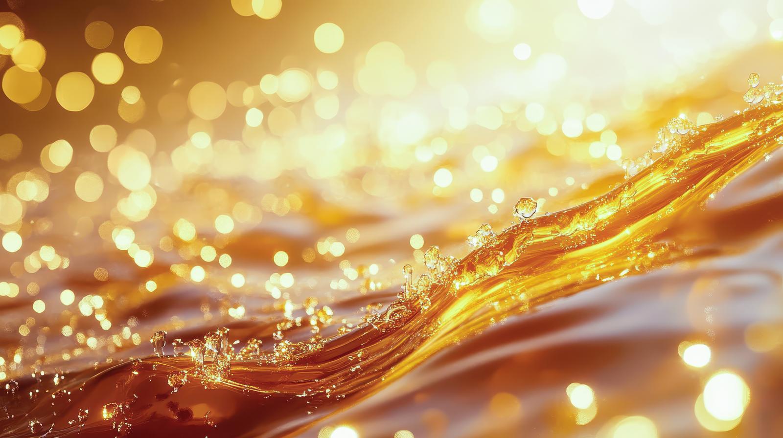 AIで生成した光と液体が流動する黄金色の画像素材です。オレンジから琥珀色に輝く液体が波立ち、水飛沫が舞い上がり、白いボケ状の光粒が浮遊する様子を表現しています。化粧品や香水のプロモーション、ウェルネス関連のデザイン、背景素材として活用できます。