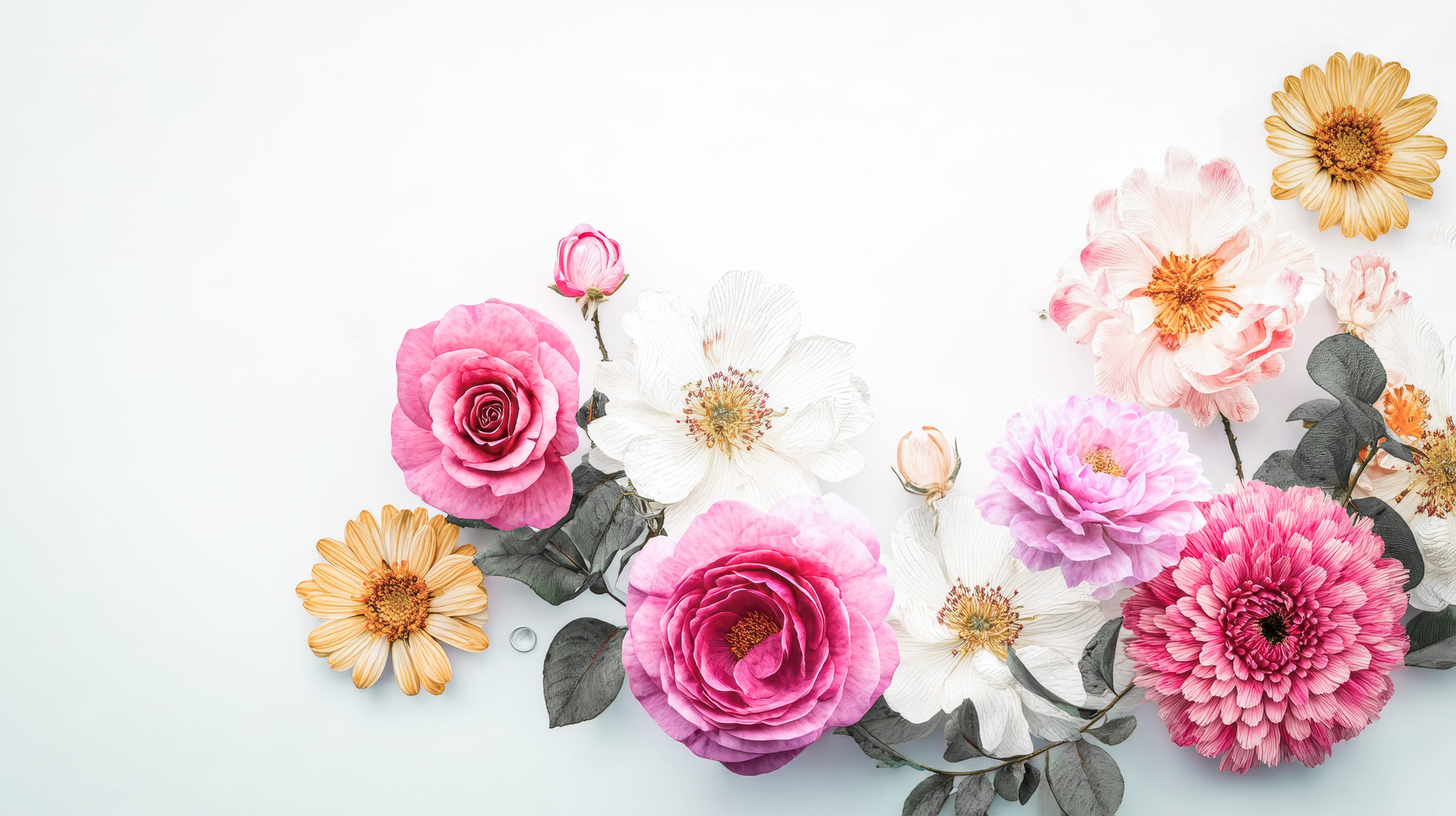 AIで生成したフラットレイスタイルのフラワーアレンジメント画像素材です。バラやガーベラ、菊などが画面下側に弧を描くように並び、左上に広い余白がある。ウェルカムボードやカードデザインの背景素材として使えます。